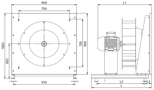 The body is made of high-quality steel resistant to corrosion. The fan blades are welded, electrostatically powder-coated, backward-curved, and designed with an aerodynamic structure to ensure smooth airflow. The motor and fan impeller are connected to the main body via a steel base.